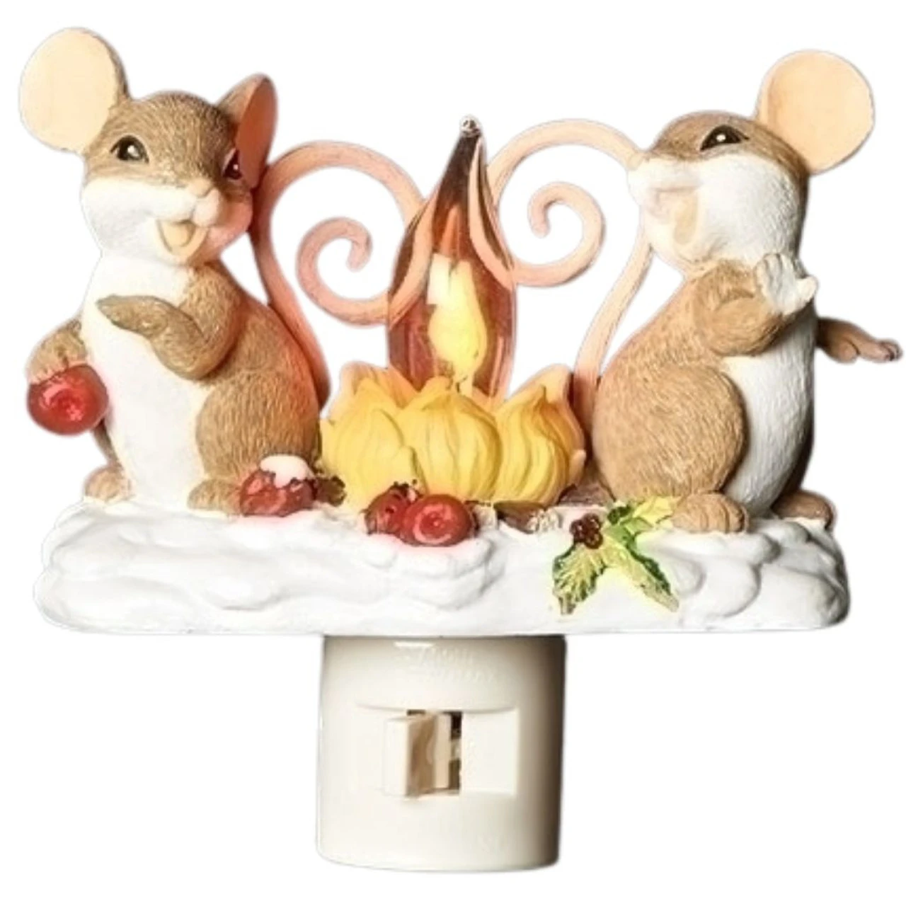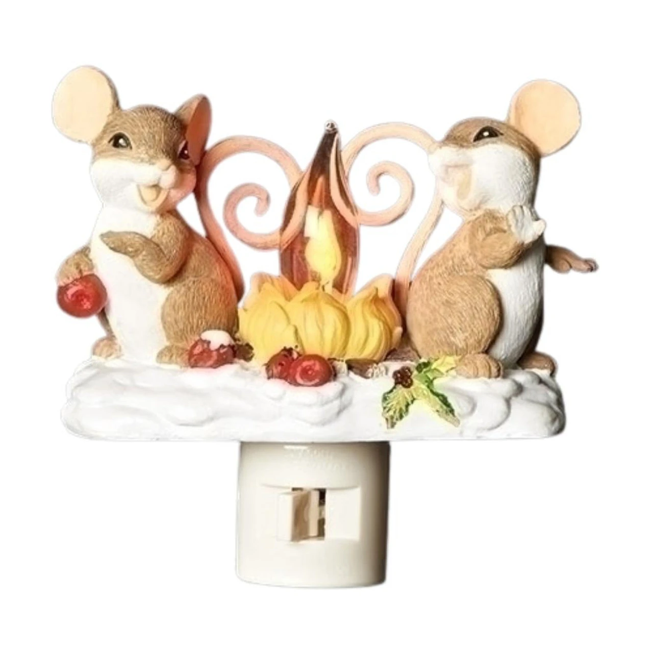 A pair of adorable happy mice sitting by the flickering light. Made of quality resin polymer stone material. Includes bulb and arrives ready to use in your outlet.