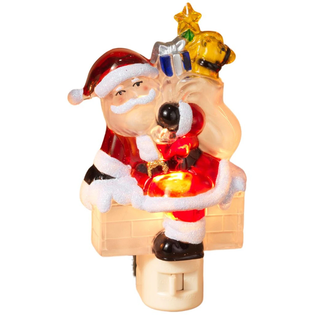 Down through the chimney goes old Saint Nick with his bag full of presents. Bring a little bit of whimsy to those dark winter nights with this Santa Claus night light. The night light is made from plastic and features a rotating swivel plug base.