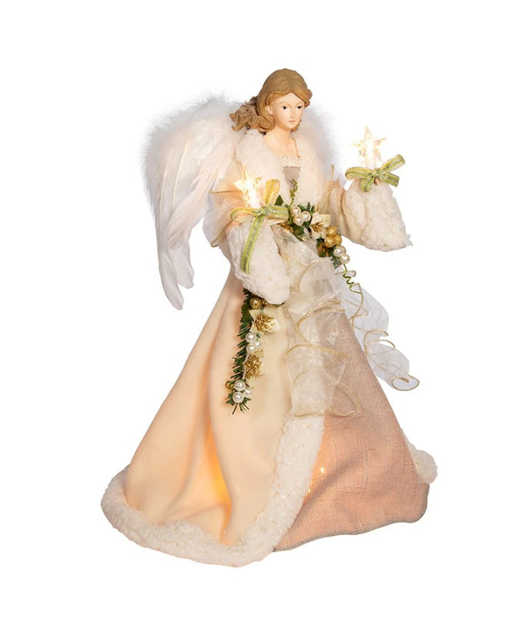 This Kurt Adler ivory and grey angel treetop is a beautiful, classic way to accent the lighting and décor of your Christmas tree. With long, painted brown hair, this angel is wearing an intricately designed ivory and grey gown with feathered wings and is illuminated by the lights within and in the star-shaped candles, she is carrying.