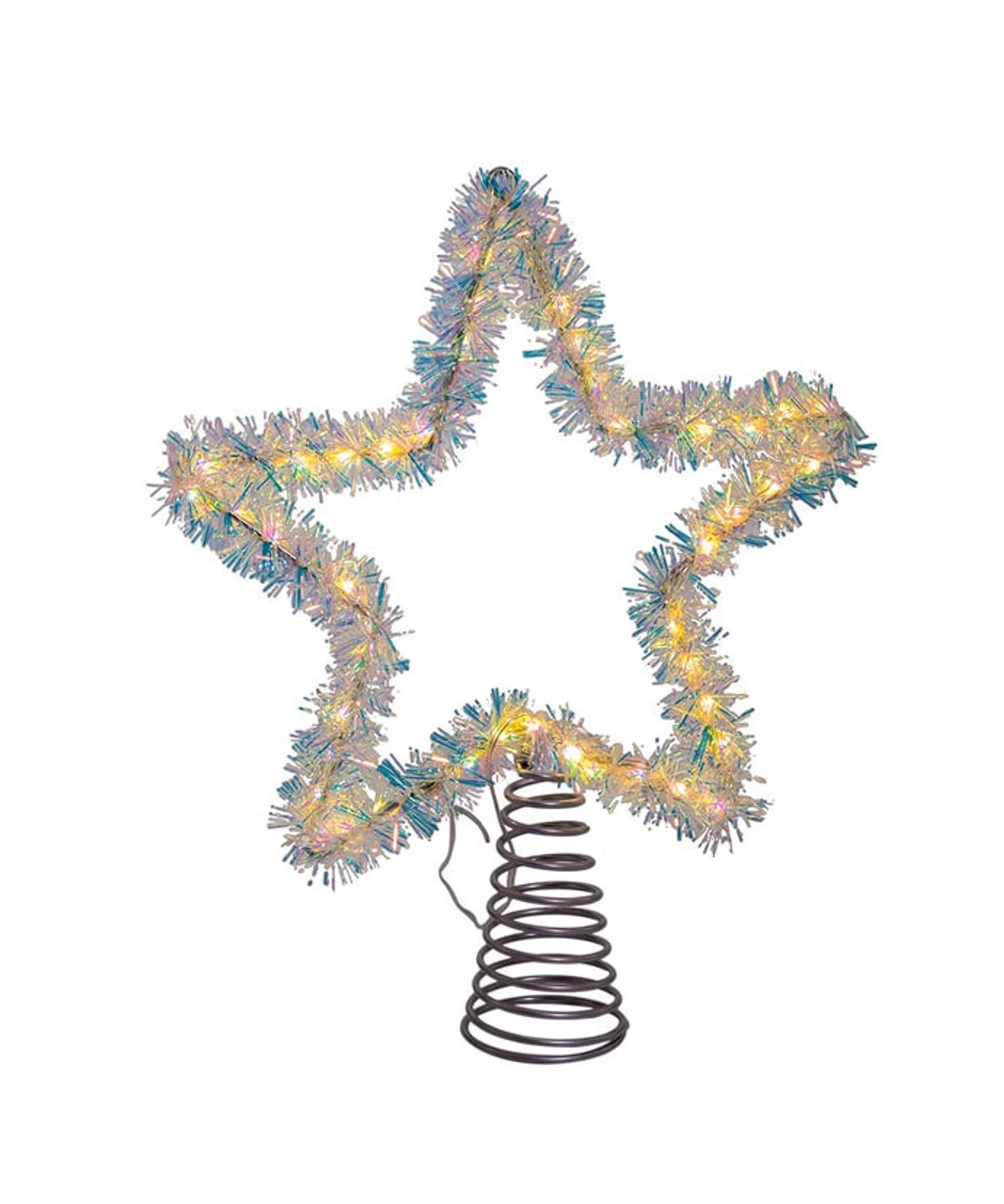 Add a beautiful twinkling touch to the lighting of your Christmas tree with Kurt Adler’s warm white silver tinsel star treetop.