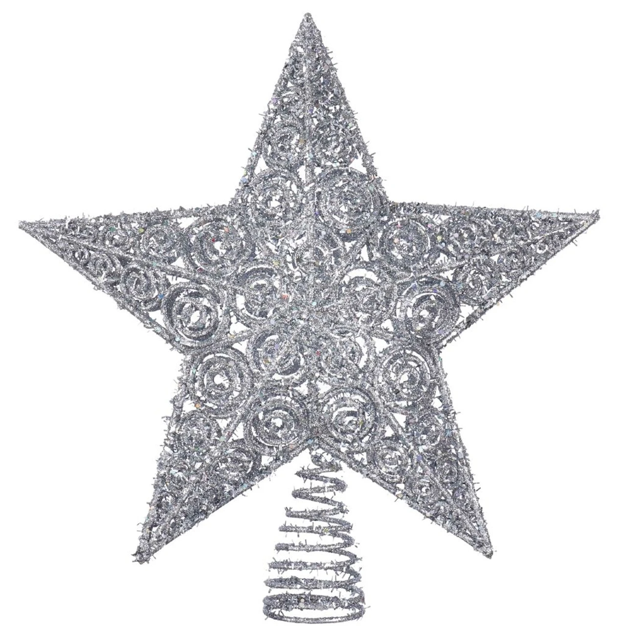 This intricately designed metal silver star tree topper is a beautiful and elegant addition to any tree. Standing approximately 12″ tall and featuring a coil base to attach to the top of your tree.