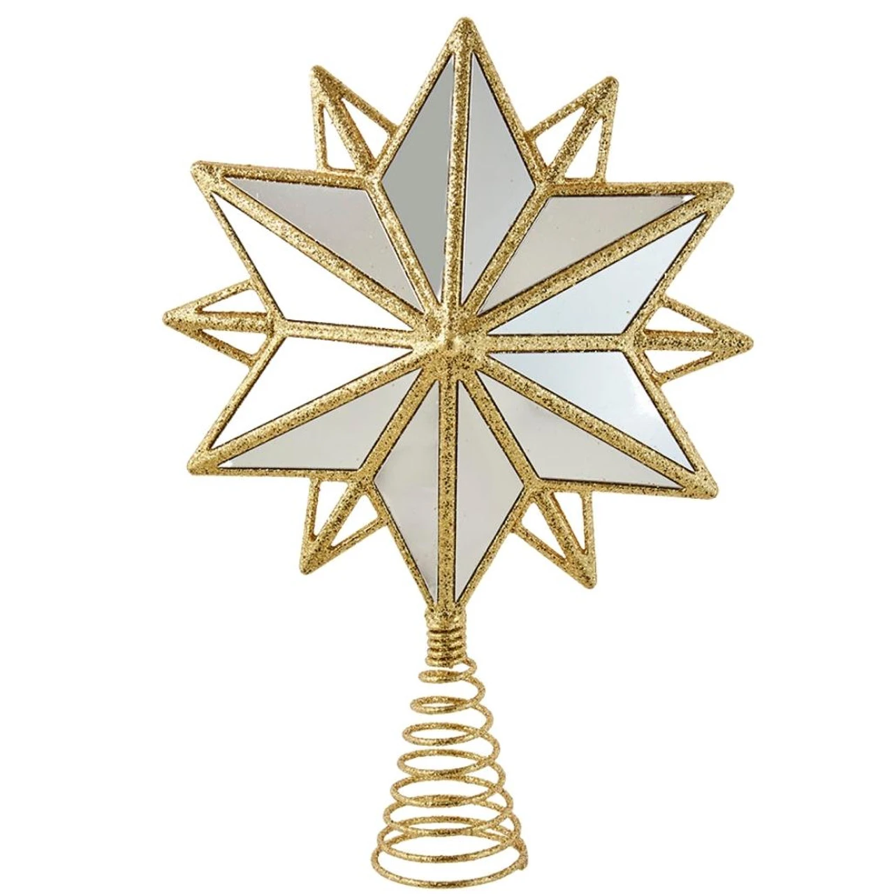 This gold star treetop from Kurt Adler is the perfect finishing touch to your Christmas tree. It features a 5-point star design with gold glittered edges and is attached to your tree by a gold glittered metal coil base.