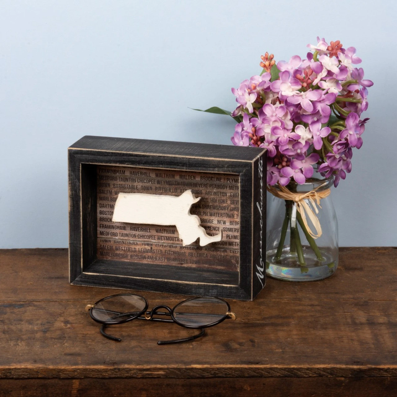 - HOME STATE PRIDE: Inset box sign with a dimensional Massachusetts state silhouette and background list of the most populated cities