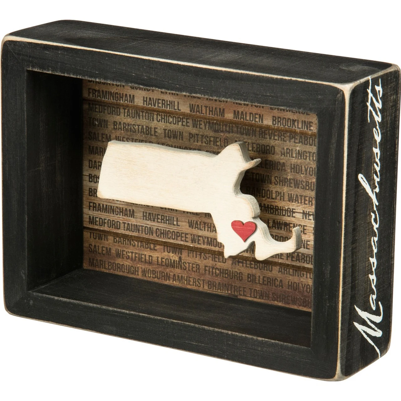 This wooden inset box sign features a dimensional Massachusetts state silhouette, a background list of the most populated cities, and an adhesive mini heart to place on a hometown or favorite spot. Includes a back sawtooth hanger or can free-stand alone on a desk, mantel, or shelf.