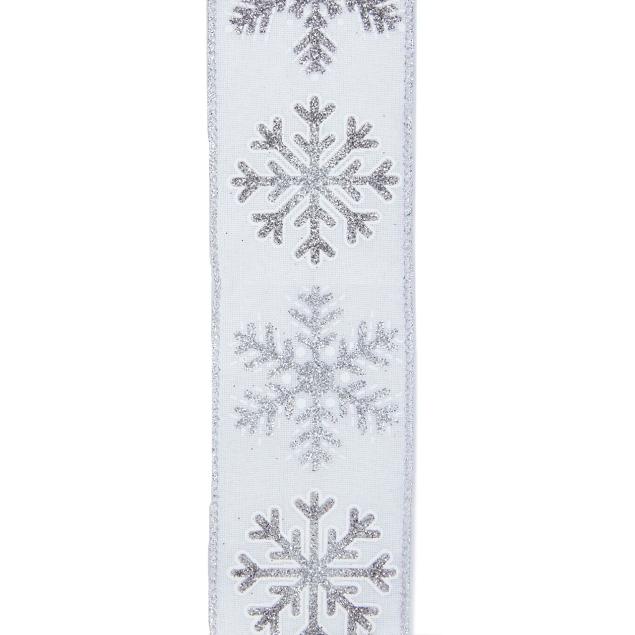 Wrap up the holidays with Kurt Adler’s woven white and silver glitter snowflake ribbon. This ribbon features silver glittered snowflakes on woven white ribbon with silver glitter edges. The double wire design allows this ribbon to be used for multiple holiday decorating needs.